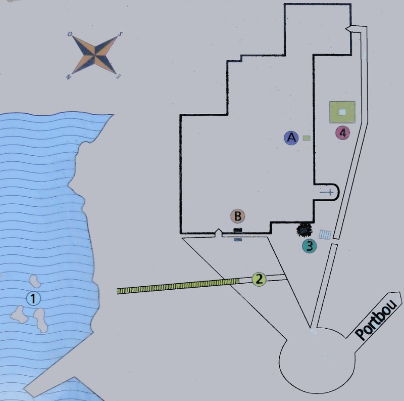 Detalls sobre el Memorial: 1 · Remolins, Ones, Roques | 2 · Corredor | 3 · Olivera | 4 · Plataforma | A · Tomba de Walter Benjamin, ninxol núm. 563 (1940-1945) | B · Plaques commemoratives