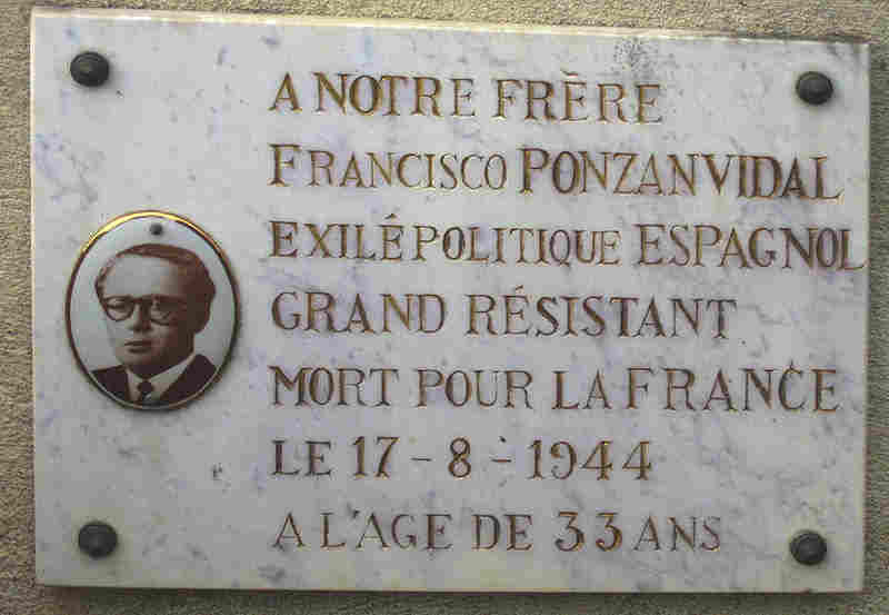 Gedenktafel am Grab des Widerstandskämpfers Francisco Ponzán. Er wurde am 17.8.1944 im Alter von 33 Jahren von den Nazis erschossen.