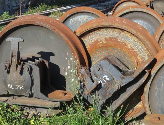 Mort (Tod) steht auf einem alten Zugrad am Bahnhof von Portbou